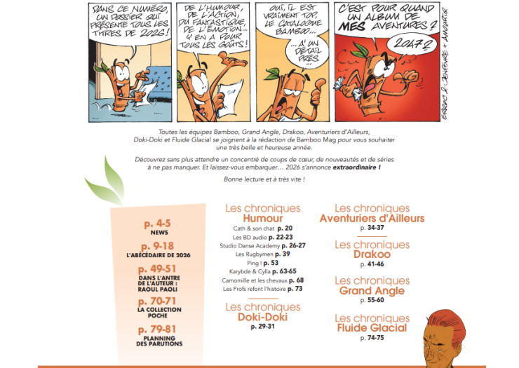 On peut notamment retrouver un échange exclusif avec Raoul Paoli, le papa de Charline, qui revient en 2026 avec un troisième tome dès le 28 janvier. Nos auteurs ont aussi travaillé pour vous concocter un très bel Abécédaire 2026 qui permet de mieux visualiser ce qui nous attend dans les prochains mois.